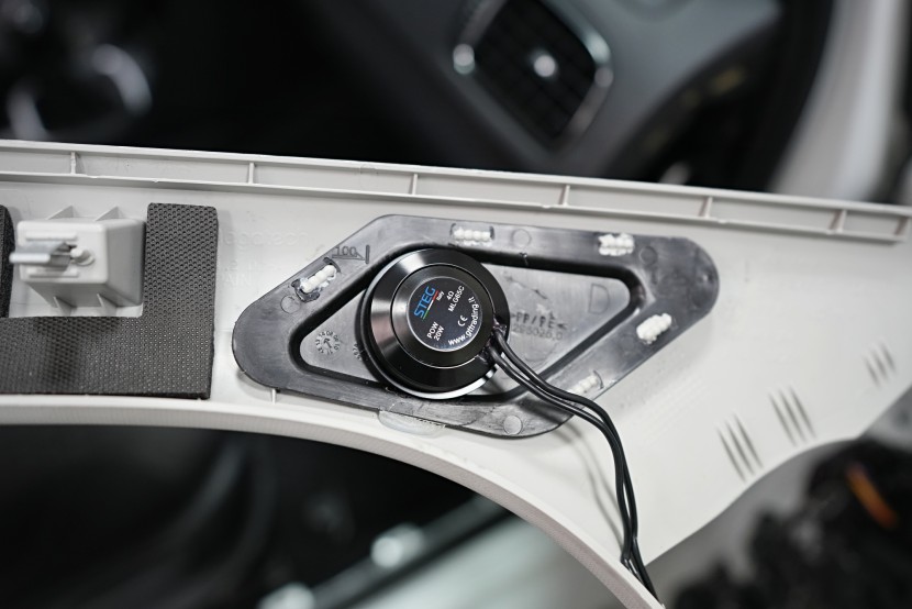 Plastové obložení A-sloupku je zpět na svém místě i s novým výškovým reproduktorem. Toto umístění vidíme raději, než například v palubní desce pod čelním sklem a výškové reproduktory lze následně i lépe směrovat a ekvalizovat v programu DSP procesoru.