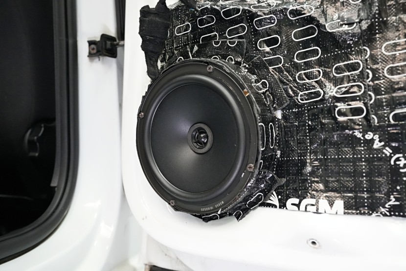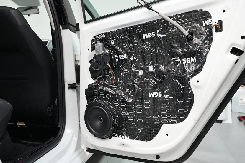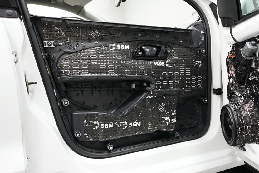 Další vrstvou je taktéž antivibrační materiál SGM Beta 2. Tato vrstva slouží k zamezení vibrací a rezonancí vnitřního plechu dveří a k vytvoření uzavřené ozvučnice pro reproduktory. Díky tomu dojde zejména ke zvýraznění basové složky nových reproduktorů. Stejný postup samozřejmě volíme i u zadních reproduktorů.