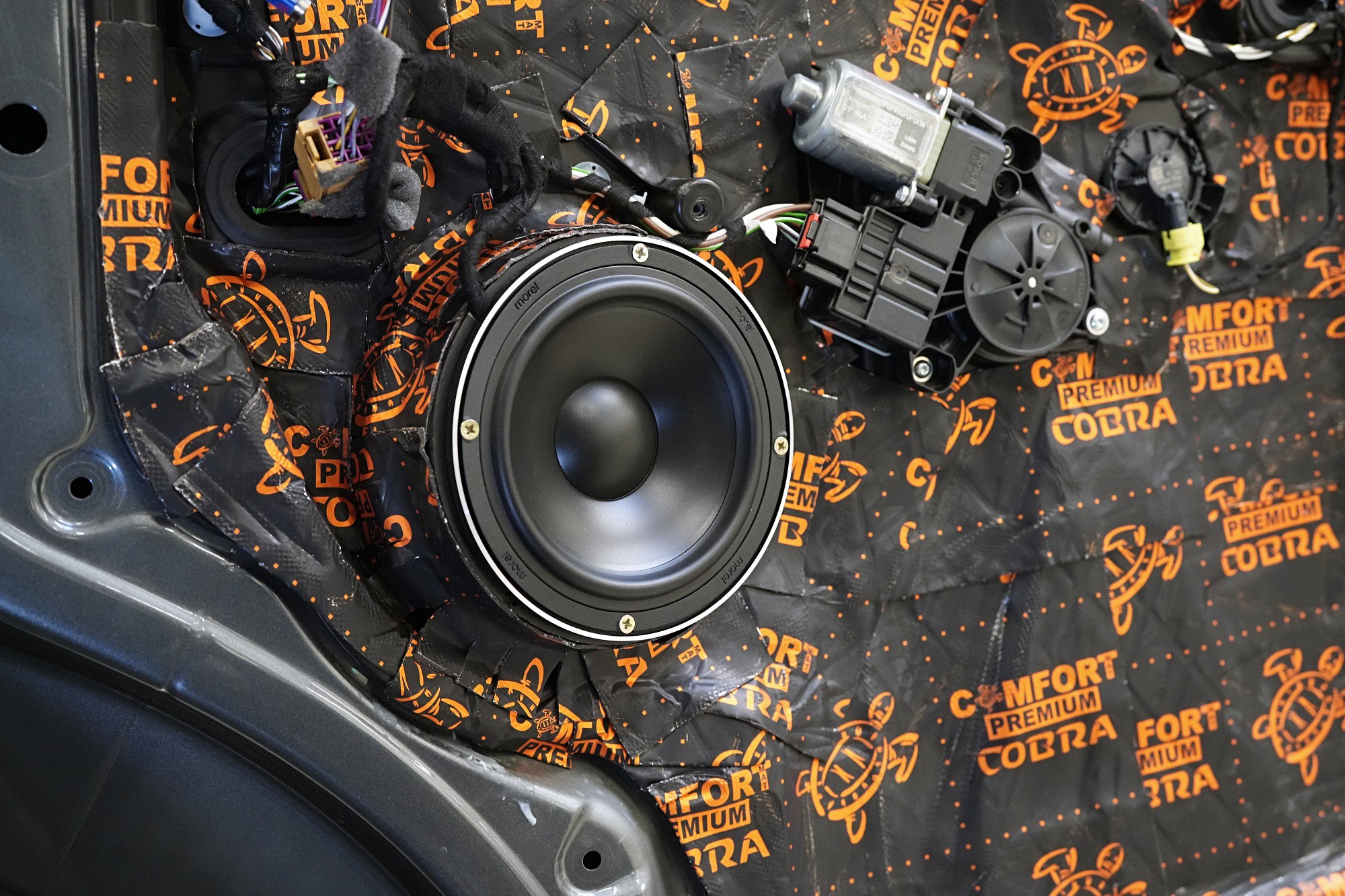 Před instalací reproduktorů došlo i na odhlučnění dveří v rámci odhlučnění celého vozu. Díváte se již na třetí vrstvu odhlučnění s antivibračním materiálem Comfortmat Cobra, který slouží k zamezení vibrací a rezonancí vnitřního plechu dveří a k vytvoření uzavřené ozvučnice pro reproduktory. Díky tomu dojde zejména ke zvýraznění basové složky nových reproduktorů.