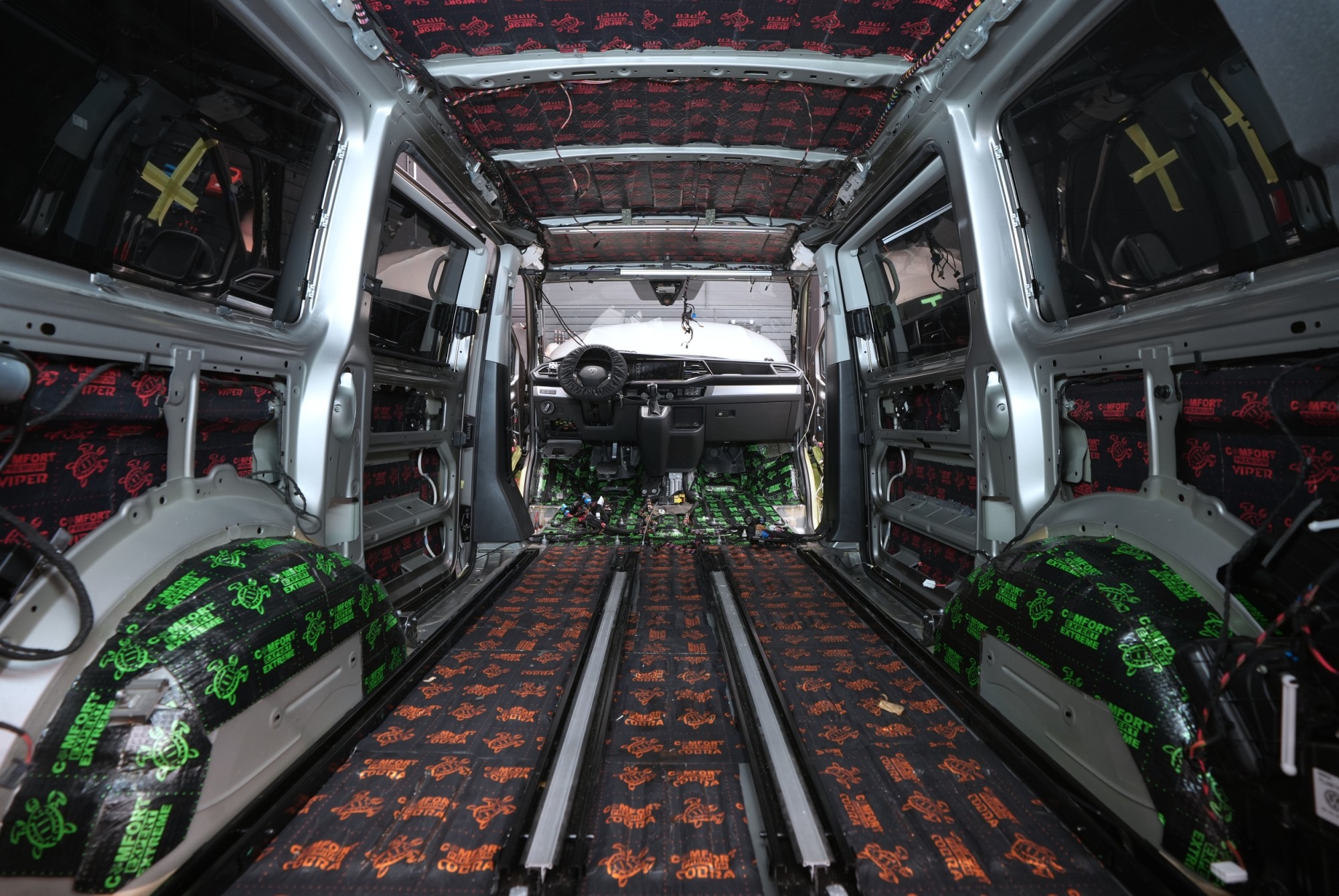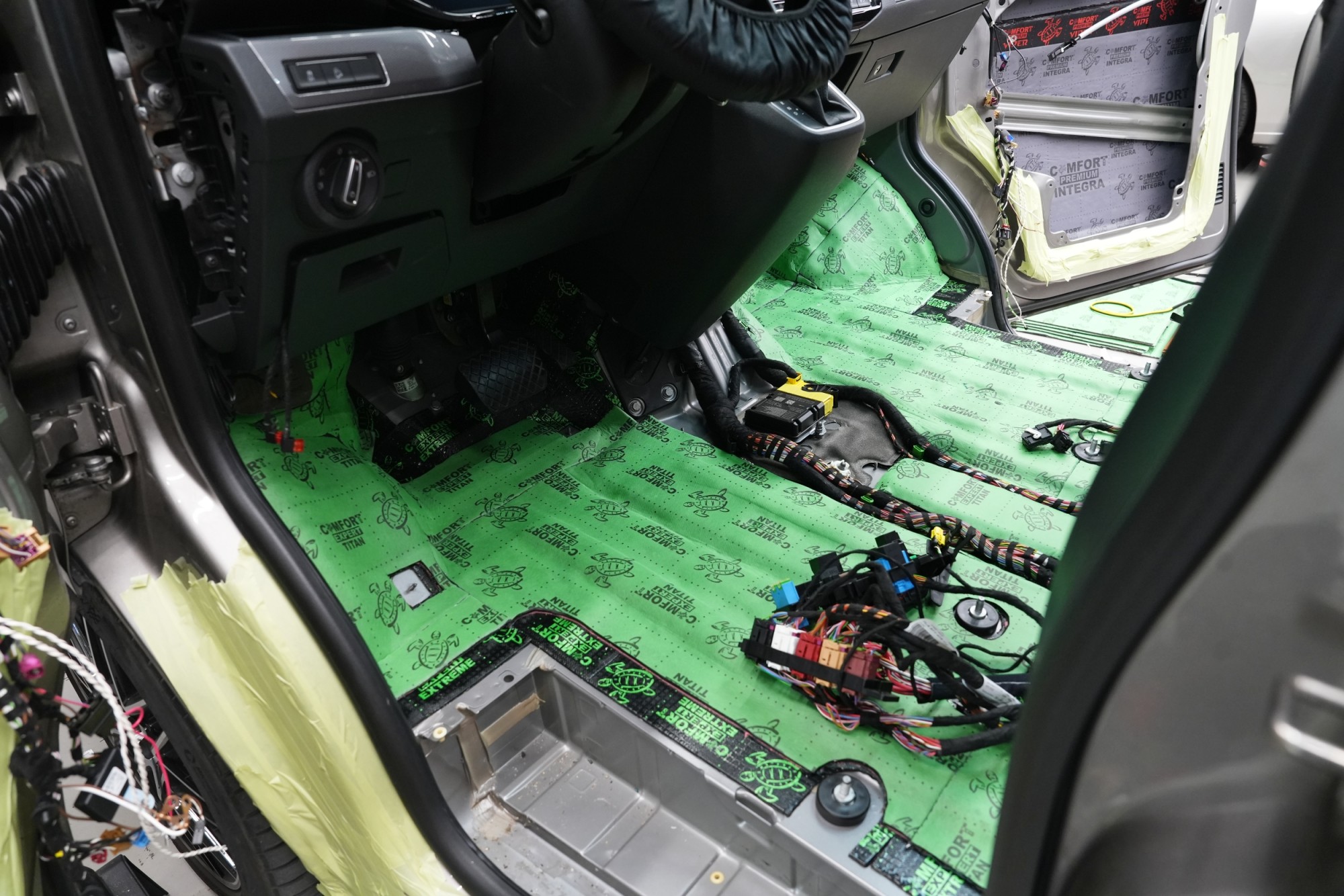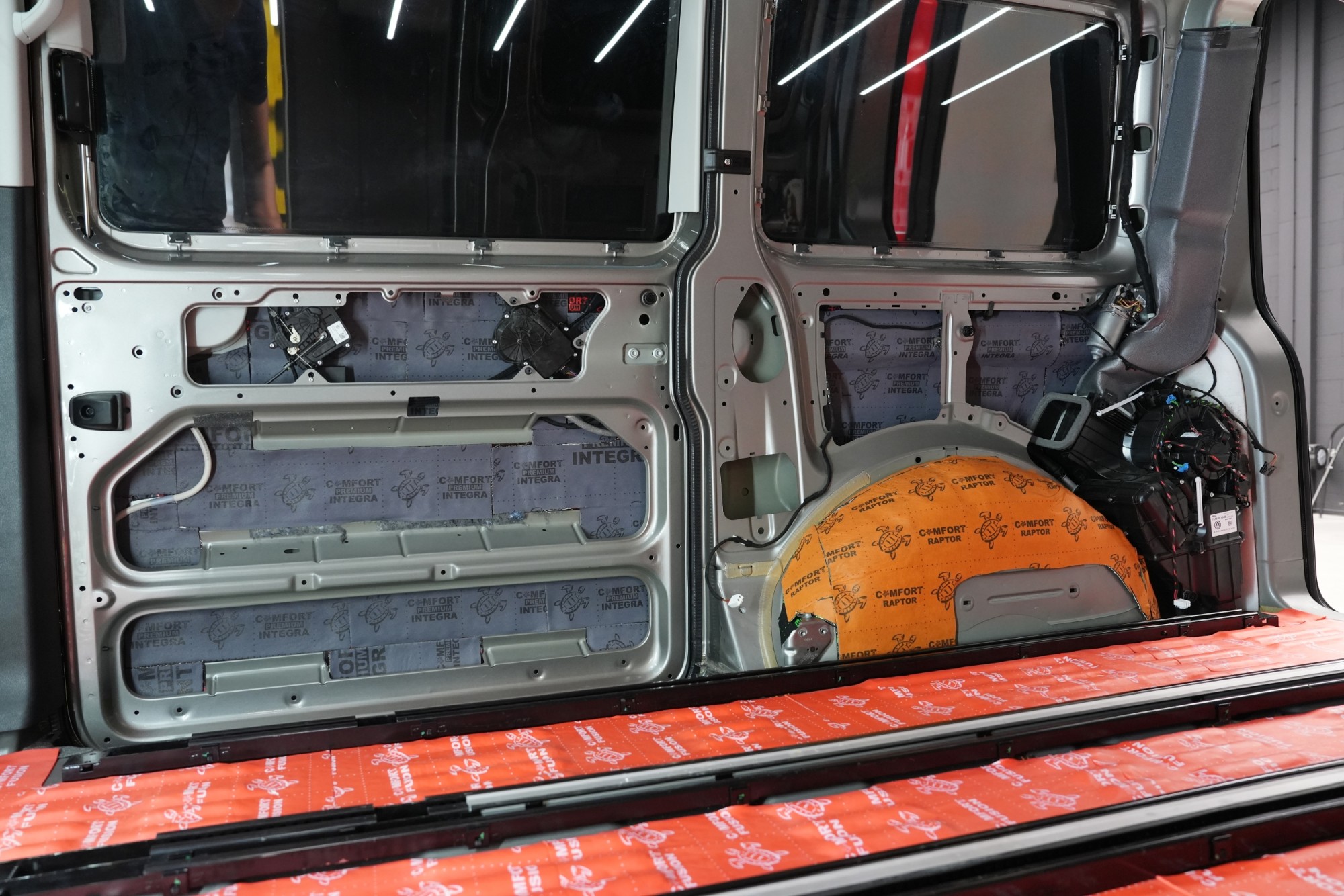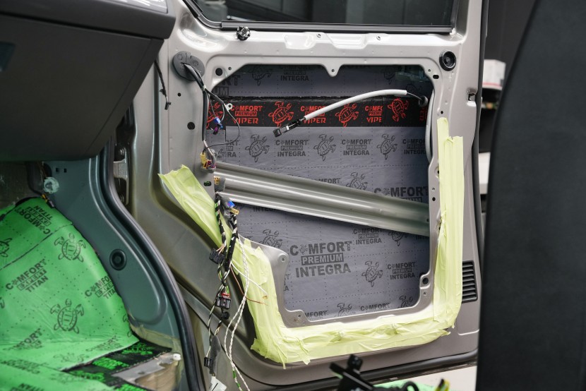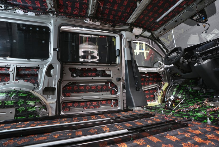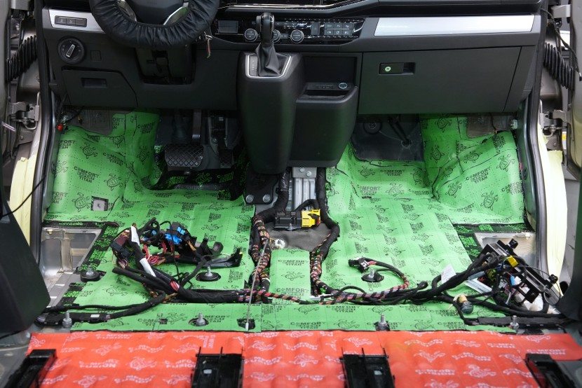 Boční pohled na interiér po aplikaci první vrstvy antivibračních materiálů. Na přední části podlahy a podbězích je použit zelený Comfortmat Extreme s dvojitou hliníkovou fólií a tloušťkou 3,5 mm, který je určen pro nejvíce namáhané plochy. Na podlaze navazuje oranžový Comfortmat Cobra o tloušťce 2,3 mm a na ostatních částech karoserie červený Comfortmat Viper s tloušťkou 3 mm. Nejen nadstandardní tloušťka, ale především vysoký akustický ztrátový činitel všech použitých materiálů umožňuje efektivní potlačení vibrací napříč celou karoserií a vytváří pevný základ pro další vrstvy odhlučnění.