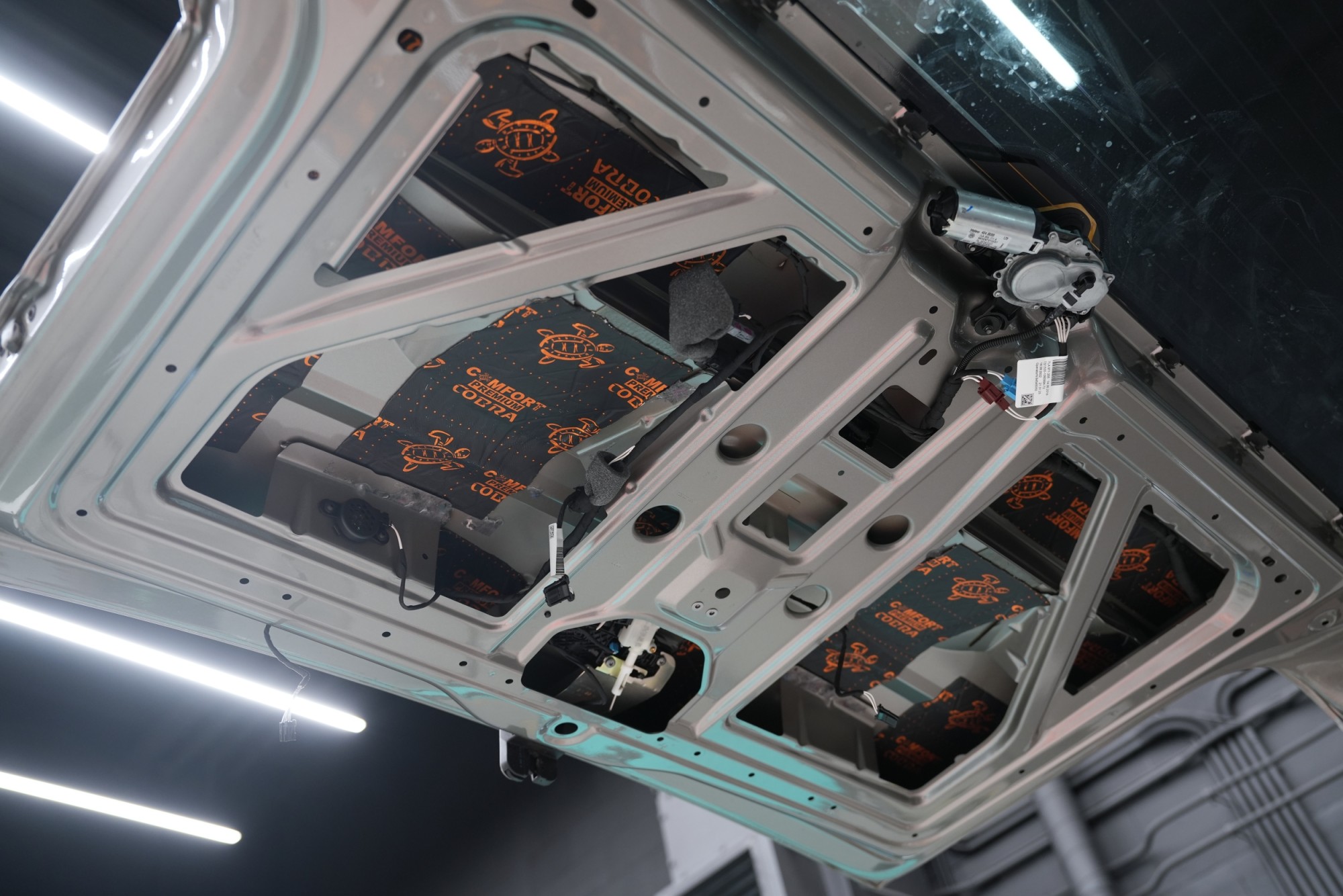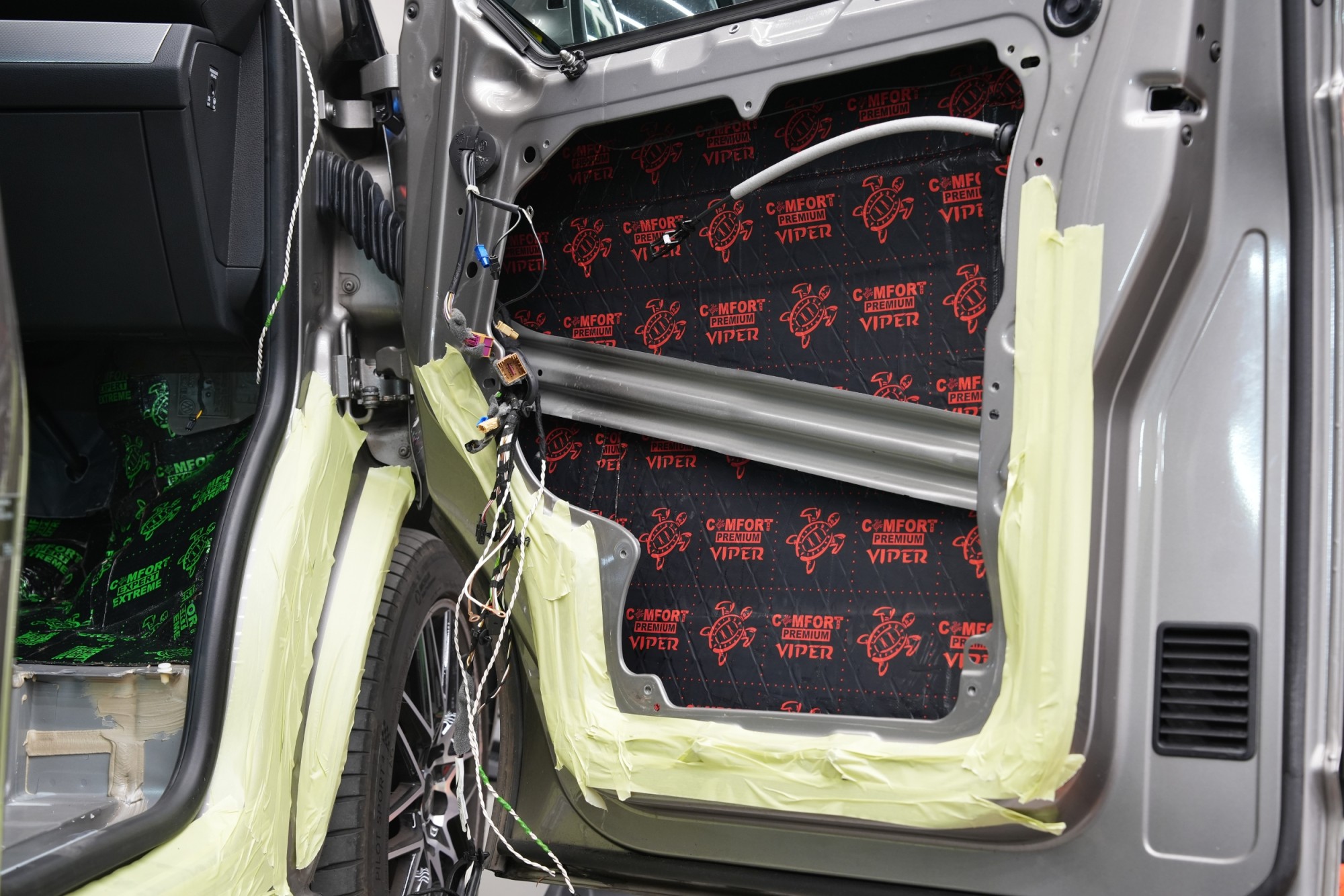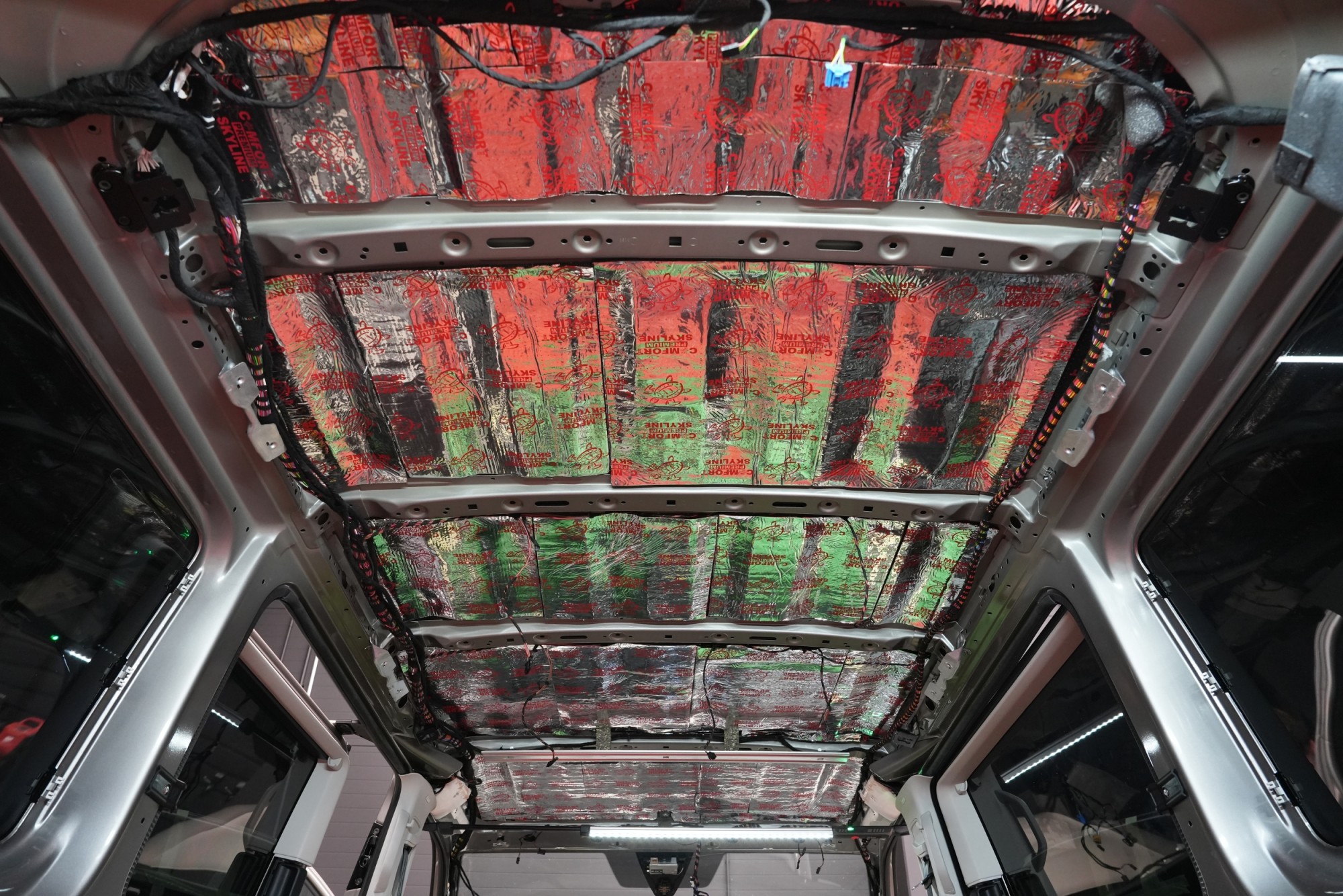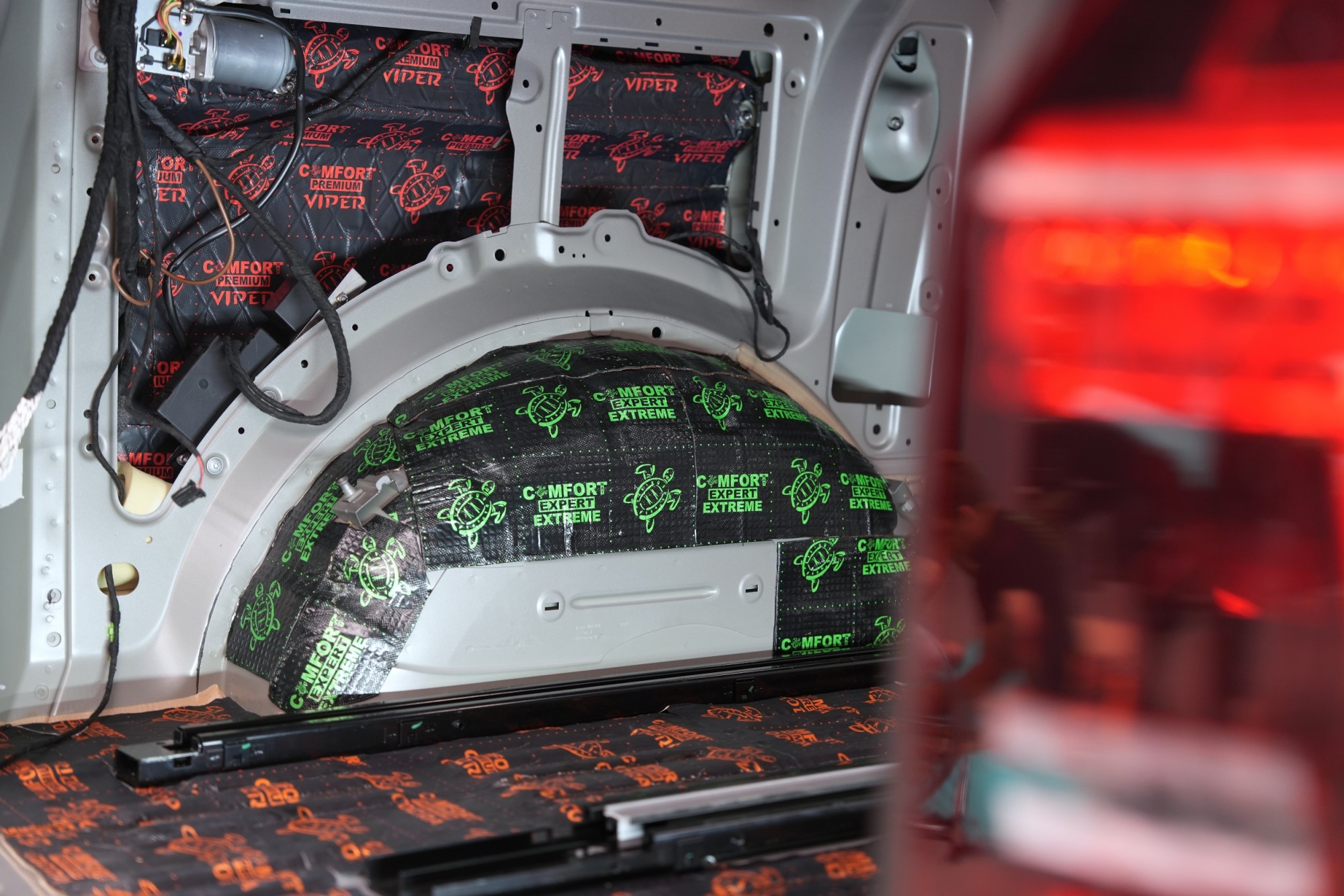 Boční pohled na interiér po aplikaci první vrstvy antivibračních materiálů. Na přední části podlahy a podbězích je použit zelený Comfortmat Extreme s dvojitou hliníkovou fólií a tloušťkou 3,5 mm, který je určen pro nejvíce namáhané plochy. Na podlaze navazuje oranžový Comfortmat Cobra o tloušťce 2,3 mm a na ostatních částech karoserie červený Comfortmat Viper s tloušťkou 3 mm. Nejen nadstandardní tloušťka, ale především vysoký akustický ztrátový činitel všech použitých materiálů umožňuje efektivní potlačení vibrací napříč celou karoserií a vytváří pevný základ pro další vrstvy odhlučnění.