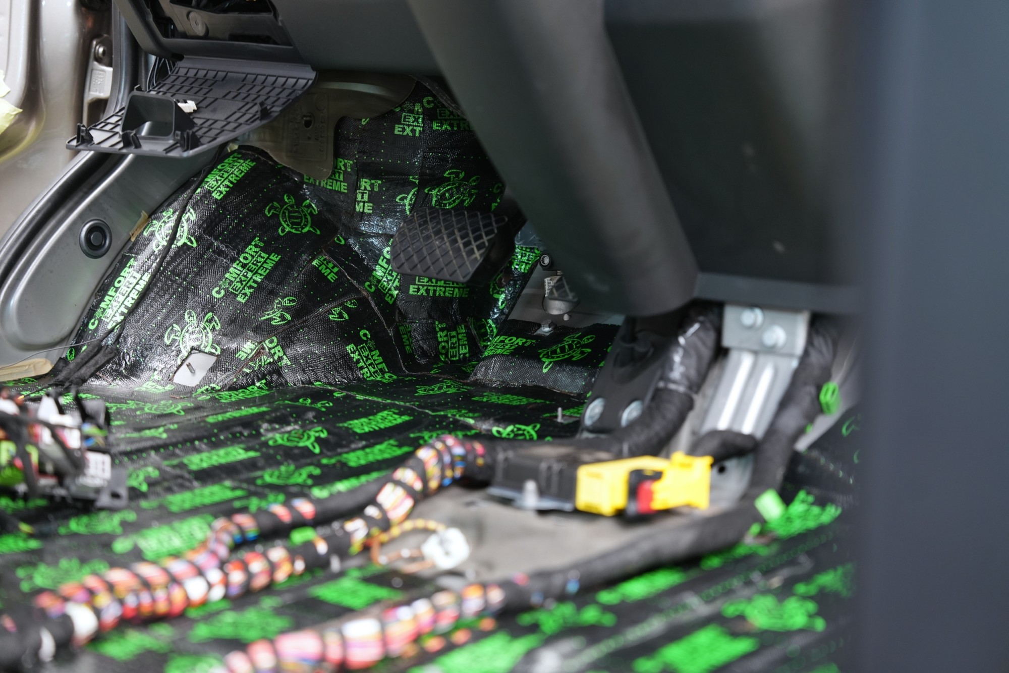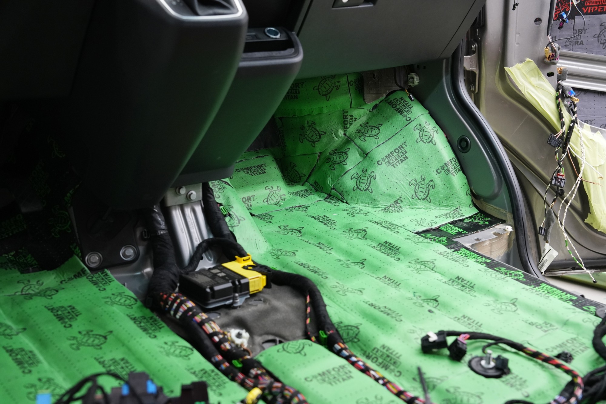 Materiály Comfortmat Extreme a Titan aplikujeme na všechny přístupné plochy karoserie bez kompromisů. V přední části podlahy se dostáváme až hluboko pod palubní desku, což nám umožňuje účinně odhlučnit i přední podběhy z vnitřní strany vozu. Právě zde je přístup k podstatně větší ploše karoserie než z vnější strany, a účinek odhlučnění je proto výrazně vyšší. Tovární odhlučnění v této oblasti ponecháváme a využíváme jej jako další vrstvu, která v kombinaci s našimi materiály zvyšuje celkovou účinnost systému.