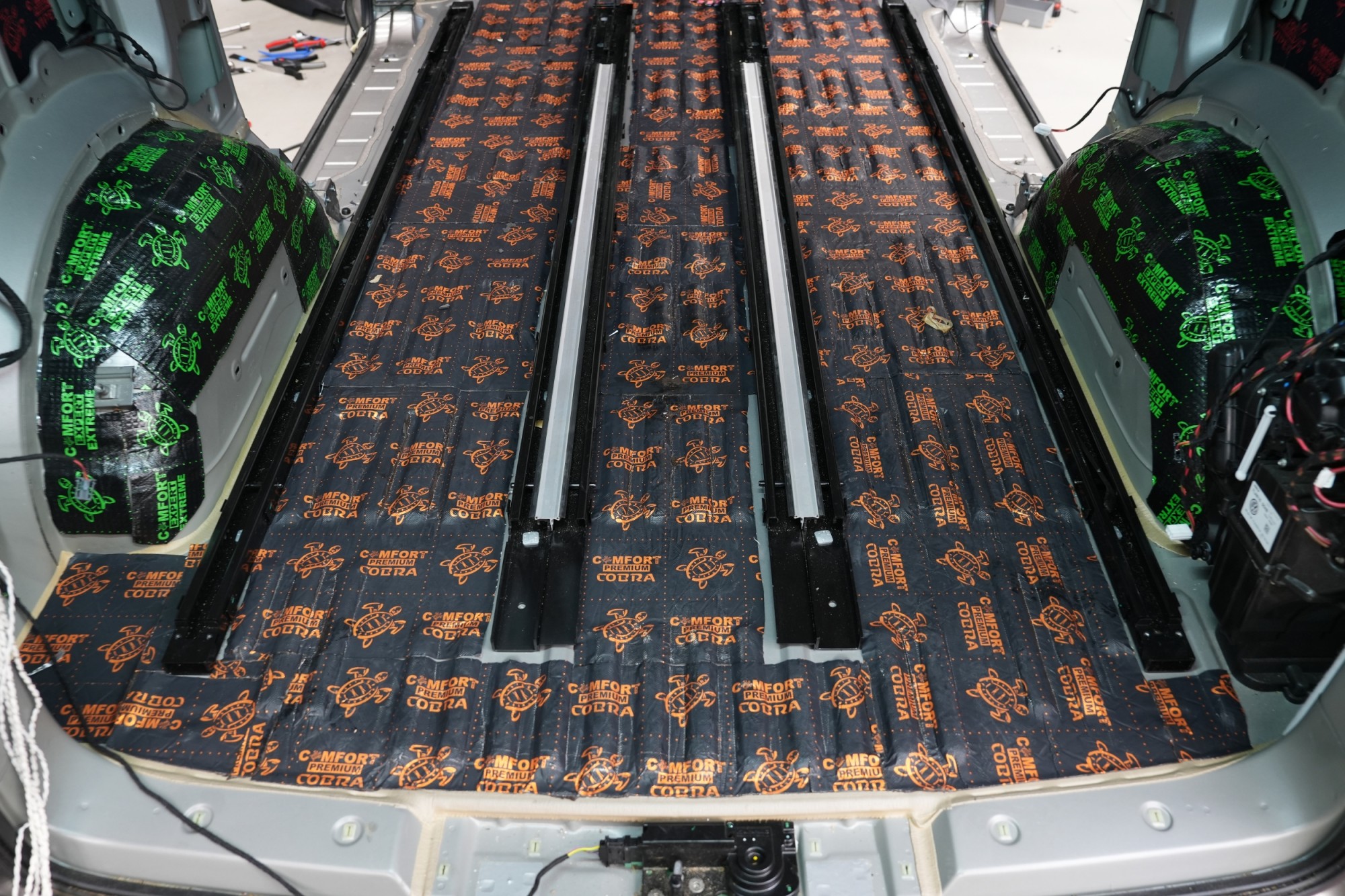 U zadní části podlahy musíme postupovat odlišným způsobem a to zejména kvůli menšímu prostoru a následné snadné instalaci interiérového obložení. V první vrstvě pracujeme s antivibračním materiálem Comfortmat Cobra o tloušťce 2,3 mm a a vysokým MLF=0,40. Vzhledem k této vysoké hodnotě se jedná o dostatečné řešení v rámci této komplikované části vozu.