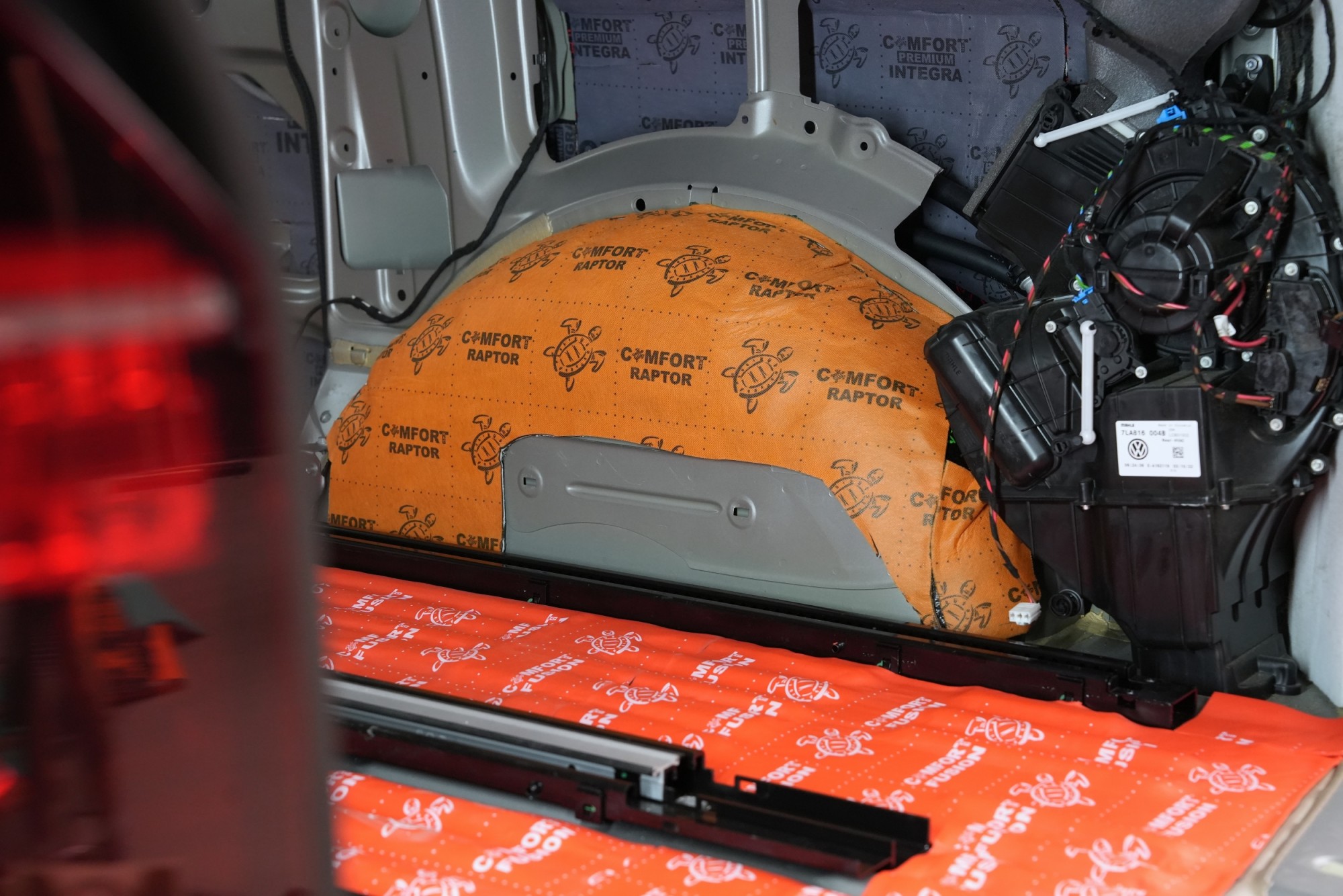 U podlahy vozu Volkswagen T6.1 musíme volit zcela jiný postup odhlučnění i ve druhé vrstvě. Místo klasického zvukově izolačního materiálu Comfortmat Raptor aplikujeme lehký červený materiál Comfortmat Fusion o tloušťce 3 mm. Fusion je sice méně účinný, ale rozdílový 1 mm hraje u podlahy tohoto vozu zásadní rozdíl při opětovném skládání interiéru.