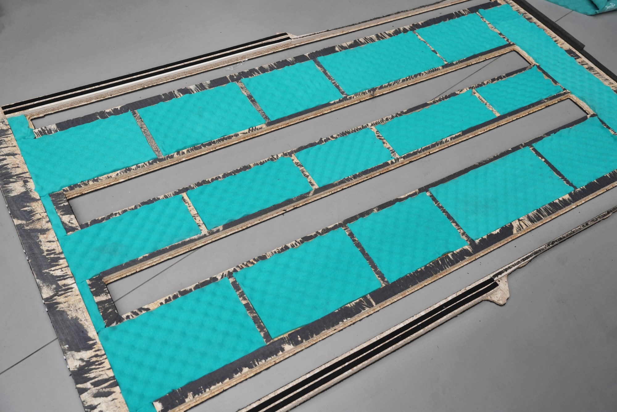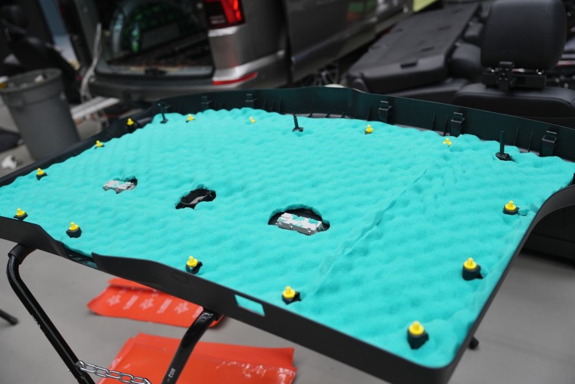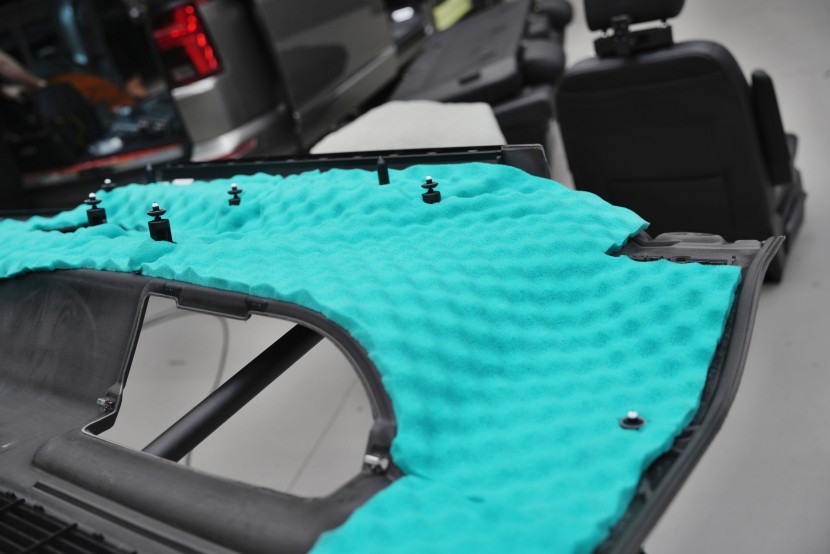 Odhlučnění podlahy dále posilujeme aplikací materiálu Comfortmat Soft Wave Expert, který instalujeme na spodní stranu podlahových panelů v zadní části vozu. Tento akustický materiál na bázi polyuretanové pěny je navržen pro efektivní pohlcování strukturálního i vzdušného hluku a díky své profilované struktuře dokáže rozptýlit zvukové vlny a snížit jejich odraz v uzavřeném prostoru karoserie.