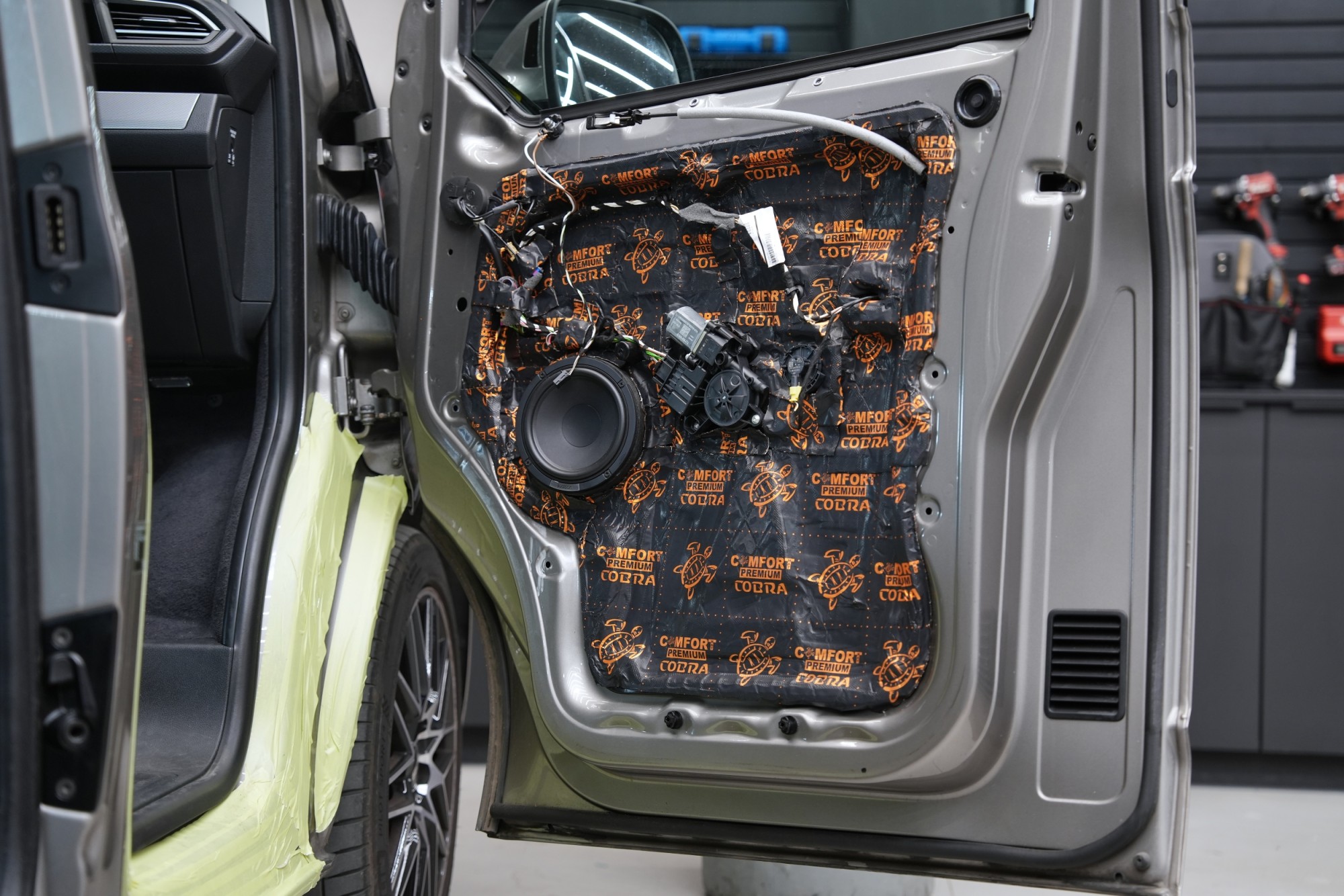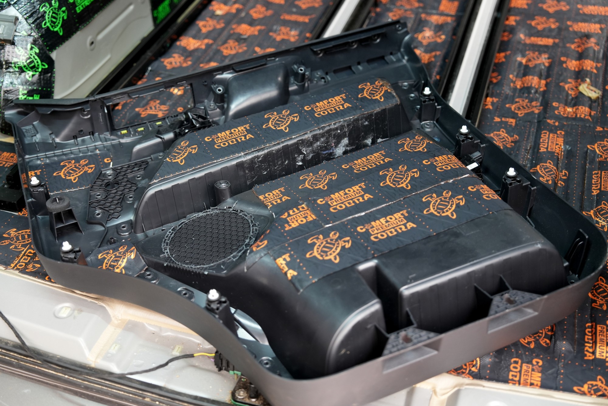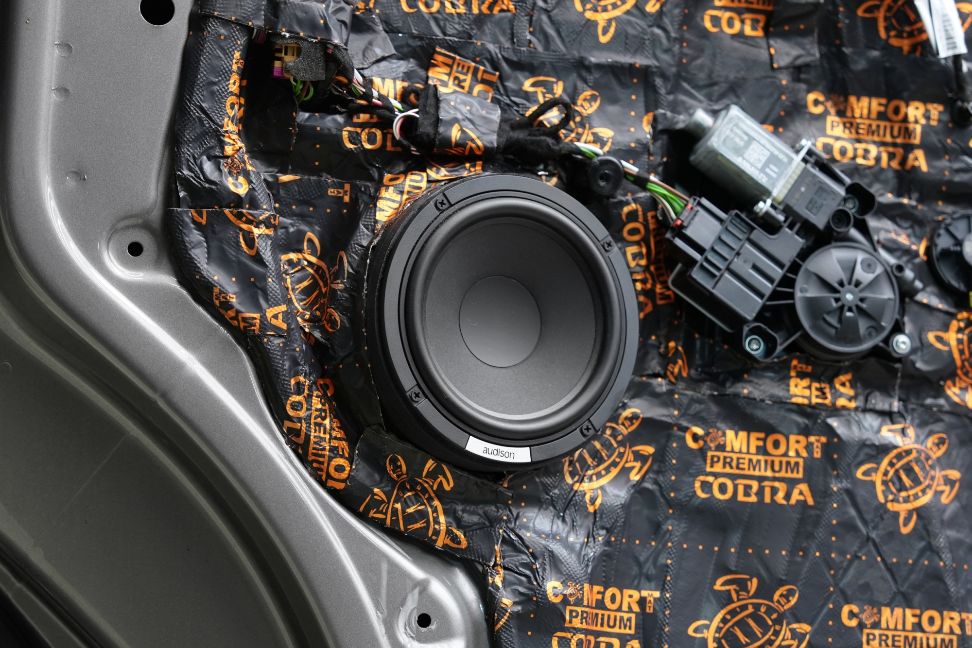 Dalším krokem je aplikace antivibračního materiálu Comfortmat Cobra o tloušťce 2,3 mm, který patří k nejlehčím a zároveň nejúčinnějším materiálům ve své kategorii. Cobra spolehlivě eliminuje vibrace a rezonance vnitřního plechu dveří a zároveň u většiny vozů vytváří funkční uzavřenou ozvučnici pro reproduktory. Tím se výrazně snižuje hluk pronikající do interiéru a současně dochází ke zlepšení kontroly membrány, přesnosti basů a celkové čitelnosti hudby, což ocení i nové reproduktory Audison