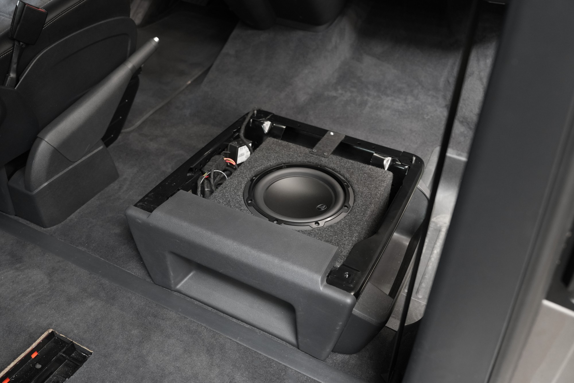 Subwoofer JL Audio je integrován do původního prostoru pod sedadlem, kde využívá tovární konstrukci bez jakéhokoli omezení interiéru. Řešení nezabírá žádný užitný prostor a nijak nezasahuje do variability vozu. Tato forma integrace kombinuje praktičnost s plnohodnotným basovým základem – bez kompromisů v každodenním používání vozu.