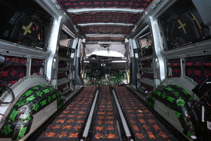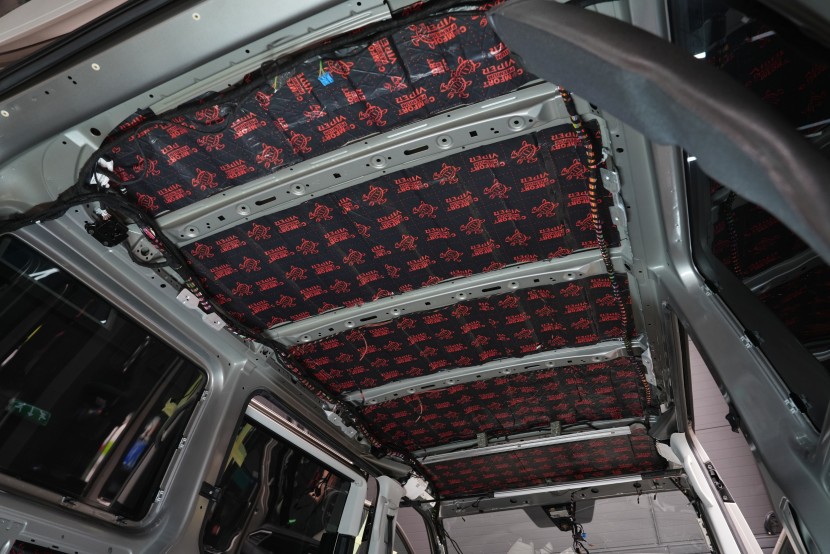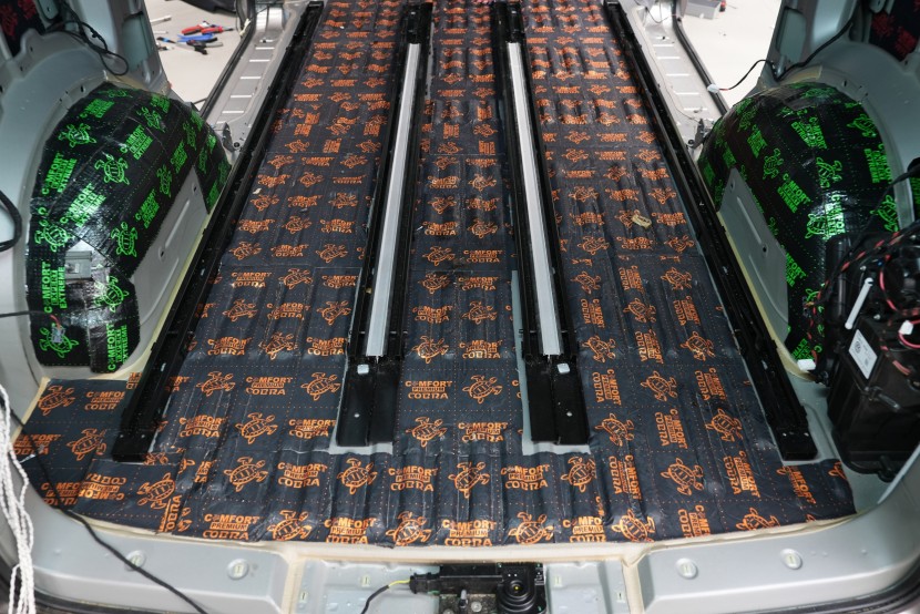 Na zadní podběhy aplikujeme stejně jako na přední část podlahy membránový materiál Comfortmat Titan, který důkladně odfiltruje agresivní hluk od pneumatik. Na boky vozu a posuvné dveře lepíme zpravidla odlehčený membránový materiál Comfortmat Integra, který používáme i pro odhlučnění předních dveří.