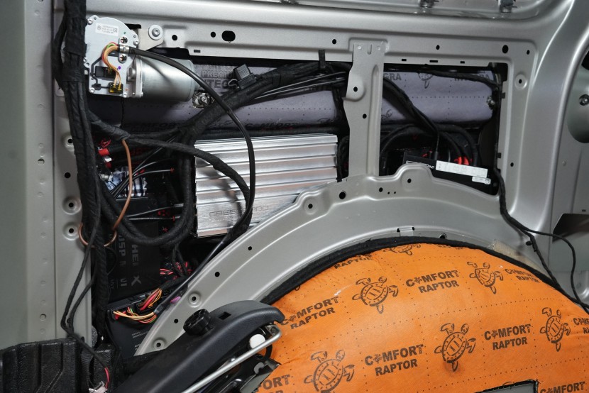 Na této fotografii vidíte důvod, proč je automobily tohoto typu radost ozvučovat. Velkorysý prostor umožní instalovat vysoce kvalitní zesilovače i externí DSP procesor, což je pro výslednou kvalitu zvuku vždy nesrovnatelně lepší možnost, než použití multikanálových zesilovačů třídy D s integrovaným DSP. Zvolili jsme analogový zesilovač Crescendo, který se prezentuje vysoce věrným a muzikálním zvukem. K němu jsme doplnili kompaktní monoblok Morel a chybět nesmí samostatný DSP procesor Helix. Samozřejmostí jsou jako vždy kvalitní kabeláž z OFC mědi a signálové kabely vyšší třídy.