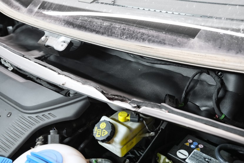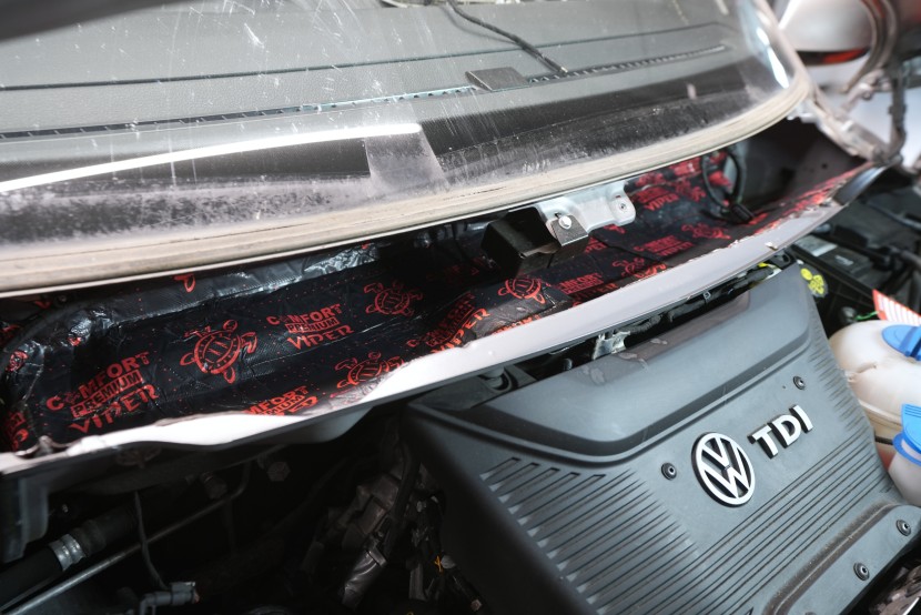 Také odhlučnění torpéda může přinést zajímavé výsledky. Stěrače jsou zdrojem silných vzduchových turbulencí a prostor pod spodním okrajem čelního skla je často veliký. Vytváří se zde efekt zvuku v jeskyni a to v bezprostřední blízkosti interiéru. Druhým důvodem k odhlučnění torpéda je snížení hluku od motoru. Nejprve tradičně aplikujeme antivibrační materiál, konkrétně Comfortmat Viper, který odfiltruje silné vibrace motoru.