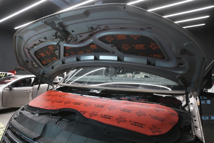 Nezapomínáme ani na kapotu, na kterou v první vrstvě aplikujeme lehký antivibrační materiál Comfortmat Cobra. Tím kapotu zpevníme, omezíme přenos vibrací do dalších částí vozu a zároveň zmizí typický plechový zvuk při jejím zavírání. Na originální kryt kapoty následně aplikujeme zvukově i tepelně izolační materiál Comfortmat Vision, který účinně sníží hluk motoru, aniž by byl narušen původní vzhled motorového prostoru.