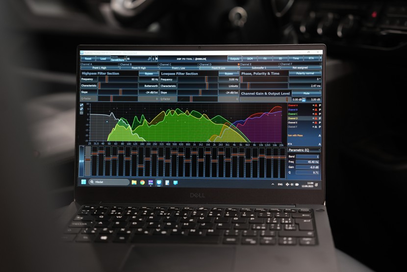 Na závěr instalace následuje měření a detailní ladění pomocí DSP procesoru. Akustika interiéru automobilu je velmi specifická a z hlediska reprodukce náročná – reproduktory nejsou umístěny ideálně, posluchač sedí mimo osu a zvuk ovlivňuje řada odrazů i překážek v kabině. Každý reproduktor proto samostatně proměříme pomocí kalibrovaného mikrofonu a profesionálního softwaru REW. Naměřená data následně využijeme při nastavení DSP, kde upravujeme časování, úrovně i frekvenční charakteristiku jednotlivých kanálů. Cílem je co nejvyrovnanější a prostorově přesný přednes, který i v akusticky složitém prostředí automobilu umožní dosáhnout maximálně věrné a kontrolované reprodukce.