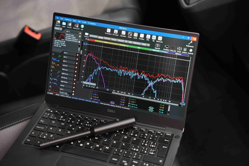 Po každém měření nastavujeme pro daný reproduktor prostorovou korekci pomocí ekvalizéru v programu DSP procesoru, kde nastavíme i časové korekce, pásmové propusti, úrovně hlasitosti, typy filtrů a další klíčové parametry. Na fotografii je vidět výsledek nastavení zvuku, konkrétně několik různých měření v jednom grafu. Klíčové je, aby levá a pravá strana vozu byly akusticky co nejvíce vyrovnané. Finální měření po správném nastavení časových korekcí a zfázování všech reproduktorů navíc umožní doplnit případné mezery ve frekvenční charakteristice v oblasti výhybek. Výsledkem je pak co nejlineárnější frekvenční odezva celého systému.