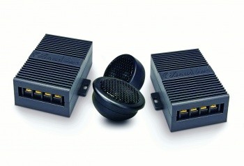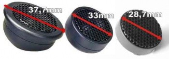 | Typ reproduktorůKoaxiální reproduktory: Koaxiální reproduktory se vyznačují konstrukcí tzv. vše v jednom. Výškový a středobasový reproduktor jsou v jednom koši. Výhodou je jednodušší montáž, ale díky spojení resp. blízkosti pásem v jednom reproduktoru, se obvykle sníží kvalita zvuku. Zpravidla uprostřed středobasového reproduktoru, je výškový reproduktor, jehož kmitací cívka pracuje ve druhé vzduchové mezeře společného magnatického obvodu. Třípásmový koaxiální reproduktor se skládá ze středobasového reproduktoru, ve předu na zvláštním nosníku je středový reproduktor a samostatný výškový. Komponentní reproduktory: Komponentní reproduktory se vyznačují rozdělením na jednotlivá frekvenční pásma, výškové + středobasové + popř. basové pásmo. Jednotlivé reproduktory se dají umístit zcela odděleně, což má za výsledek lepší zvukový i akustický projev. V drtivé většině případů komponentních reproduktorů je dodávaná i externí výhybka, která rozděluje výškové, středové / středobasové a u třípásma i basové pásmo popř. umožňuje nastavení decibelové úrovně u výškového reproduktoru (např. +2 dB, 0 dB, -2 dB), strmosti (např. 6dB/Okt. 12dB/Okt.) či aktivní nebo bi-amp zapojení. | Výškové |