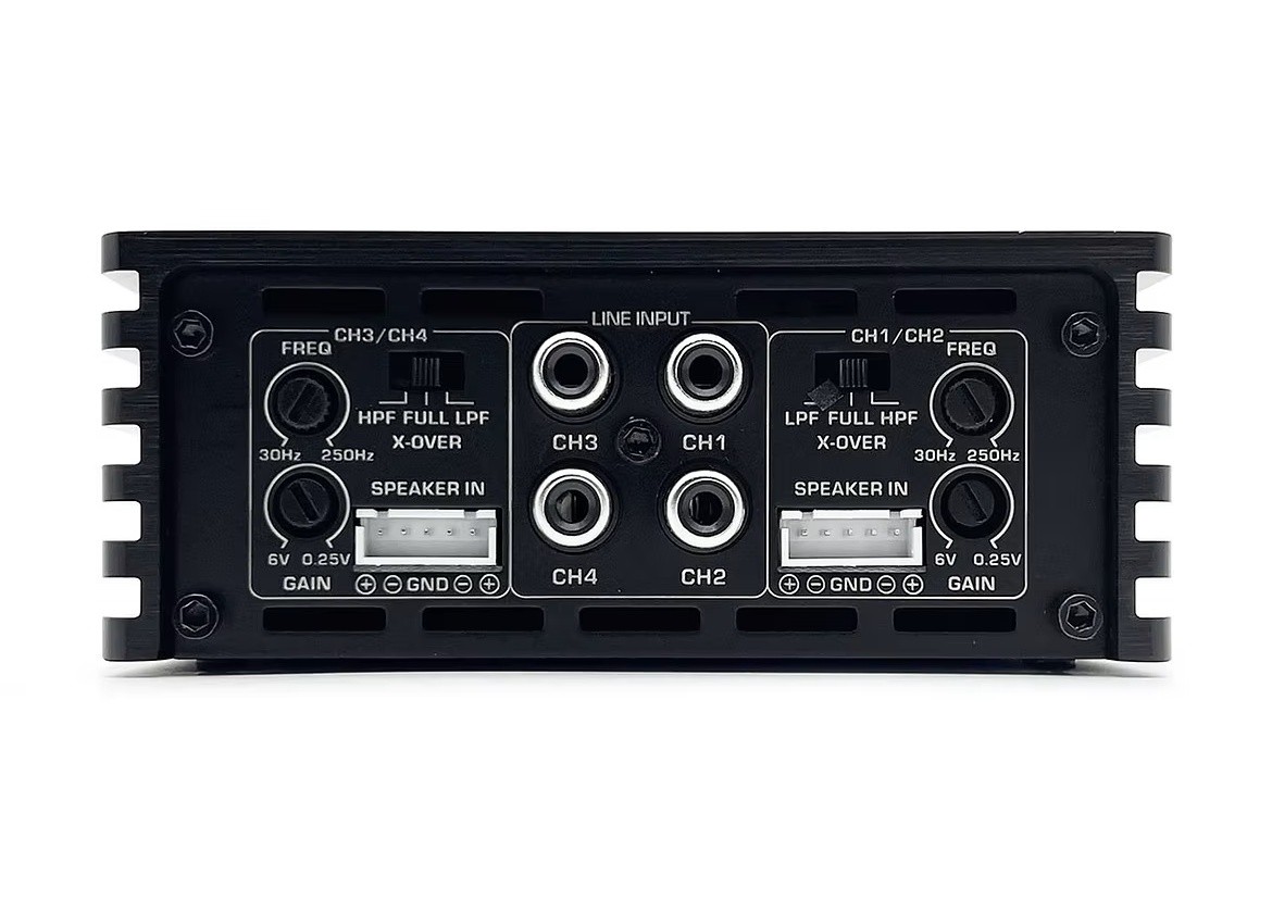 | Vstupní citlivostAby mohl zesilovač plnit správně svoji funkci, vyžaduje vstupní signál určité urovně, který je u autorádií různý. Měří se ve "Voltech" (např. 2 V, 4 V atd.) Čím vyšší hodnota na výstupu předzesilovače, neboli autorádia, tím jsou kladeny menší nároky na výkon zesilovače. Zesilovač ale musí právě tuto vstupní citlivost umožňovat a z toho důvodu se uvádí tato hodnota i u zesilovače. | 0,25 - 6 V |