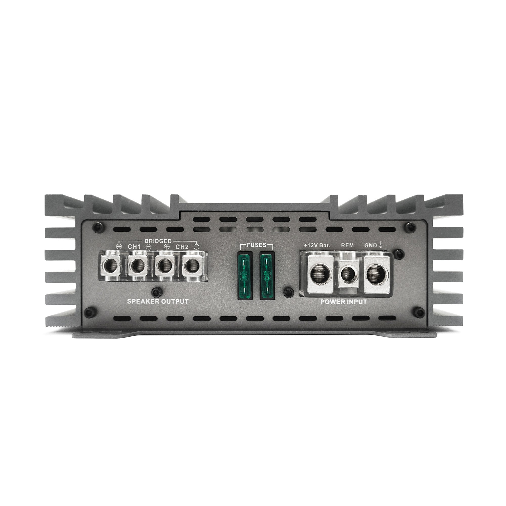 | Počet kanálů zesilovačeZesilovače se rozdělují na: - Monobloky - 2kanálové - 3kanálové - 4kanálové - 5kanálové - 6kanálové - více kanálové Každý kanál slouží na napájení jednoho reproduktoru u koaxialního typu, popř. jedné strany, pokud se jedná o komponentní reproduktory. Zesilovače typu monoblok se používají hlavně na subwoofery. 2kanálové jsou vhodné jak na subwoofery, tak například na přední pár reproduktorů v autě. 3kanálové se používá na přední nebo zadní reproduktory + subwoofer. 4kanálové se používají na přední + zadní reproduktory nebo 1 pár reproduktorů + subwoofer. 6 nebo 5kanálové se používají na 2 páry reproduktorů + subwoofer, nejčastěji. Můstkování znamená zapojení zesilovače do můstku, kdy se použije + pól z jednoho kanálu a - pól z druhého kanálu. Ve většině případů to bývá na zesilovači znázorněné jako "BRIDGED". | 2 |