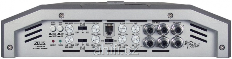 | Počet kanálů zesilovačeZesilovače se rozdělují na: - Monobloky - 2kanálové - 3kanálové - 4kanálové - 5kanálové - 6kanálové - více kanálové Každý kanál slouží na napájení jednoho reproduktoru u koaxialního typu, popř. jedné strany, pokud se jedná o komponentní reproduktory. Zesilovače typu monoblok se používají hlavně na subwoofery. 2kanálové jsou vhodné jak na subwoofery, tak například na přední pár reproduktorů v autě. 3kanálové se používá na přední nebo zadní reproduktory + subwoofer. 4kanálové se používají na přední + zadní reproduktory nebo 1 pár reproduktorů + subwoofer. 6 nebo 5kanálové se používají na 2 páry reproduktorů + subwoofer, nejčastěji. Můstkování znamená zapojení zesilovače do můstku, kdy se použije + pól z jednoho kanálu a - pól z druhého kanálu. Ve většině případů to bývá na zesilovači znázorněné jako "BRIDGED". | 4/3/2 |