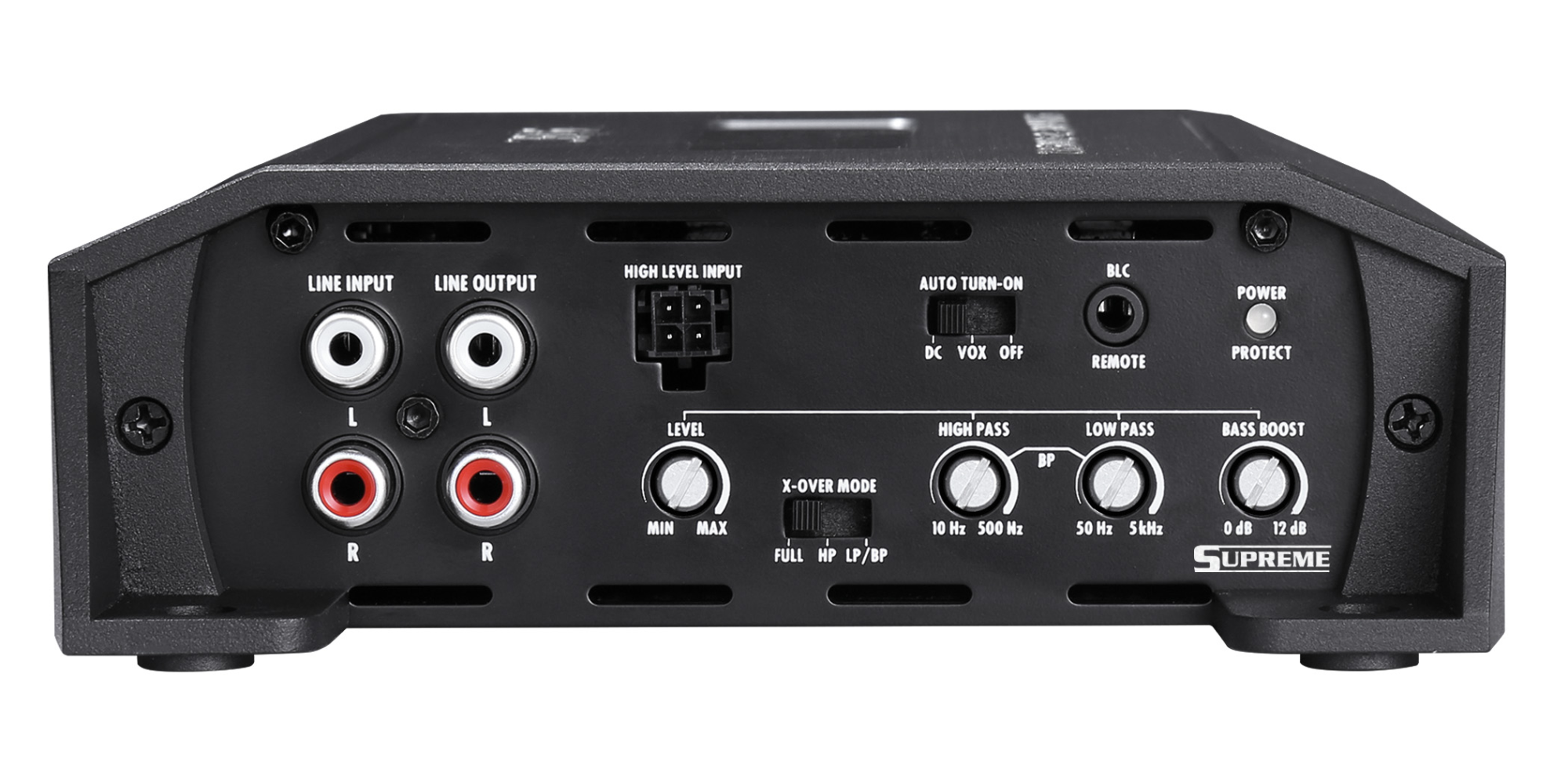 | Horní pásmová propust (HPF)HPF / HP resp. "hi pass filter" nabízí možnost nastavení zesilovače pomocí potenciometru tak, aby střední, případně středobasové a výškové frekvence hrály od určité frekvence směrem nahoru. Příklad: Zesilovače mají nejčastěji HPF od 40 do 300 Hz. Pokud nastavíme na potenciometru hodnotu cca. 150 Hz, budou zvuk ořezán tak, že bude hrát frekvence od 150 Hz až po maximální horní hranici celého frekvenčního rozsahu zesilovače, třeba až 20.000 Hz. Doporučujeme nastavovat tento potenciometr v rozmezí 80-160 Hz. Díky této možnosti nastavení snesou reproduktory vyšší výkon, jelikož je nebudete přetěžovat basy ve spodním frekvenčním pásmu. | 10 - 500 Hz |