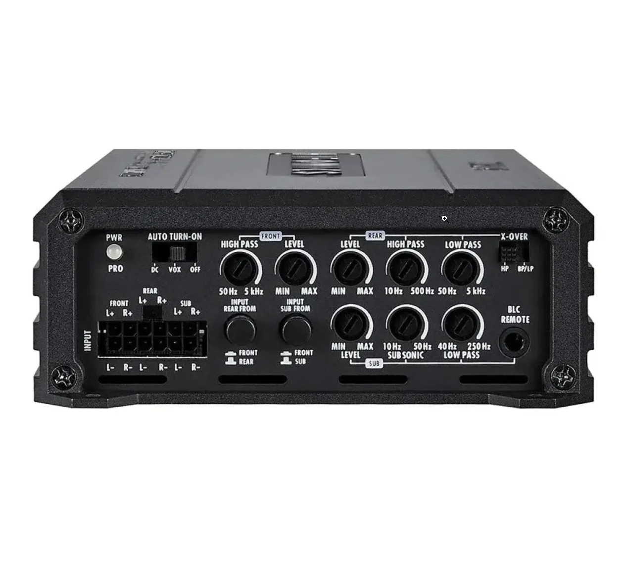 | Počet kanálů zesilovačeZesilovače se rozdělují na: - Monobloky - 2kanálové - 3kanálové - 4kanálové - 5kanálové - 6kanálové - více kanálové Každý kanál slouží na napájení jednoho reproduktoru u koaxialního typu, popř. jedné strany, pokud se jedná o komponentní reproduktory. Zesilovače typu monoblok se používají hlavně na subwoofery. 2kanálové jsou vhodné jak na subwoofery, tak například na přední pár reproduktorů v autě. 3kanálové se používá na přední nebo zadní reproduktory + subwoofer. 4kanálové se používají na přední + zadní reproduktory nebo 1 pár reproduktorů + subwoofer. 6 nebo 5kanálové se používají na 2 páry reproduktorů + subwoofer, nejčastěji. Můstkování znamená zapojení zesilovače do můstku, kdy se použije + pól z jednoho kanálu a - pól z druhého kanálu. Ve většině případů to bývá na zesilovači znázorněné jako "BRIDGED". | 5 |