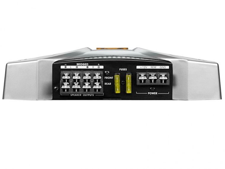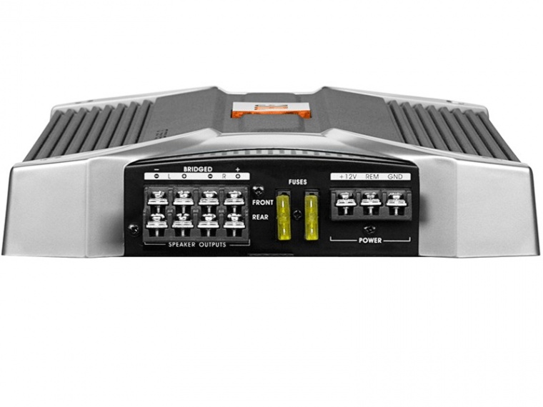 | Počet kanálů zesilovačeZesilovače se rozdělují na: - Monobloky - 2kanálové - 3kanálové - 4kanálové - 5kanálové - 6kanálové - více kanálové Každý kanál slouží na napájení jednoho reproduktoru u koaxialního typu, popř. jedné strany, pokud se jedná o komponentní reproduktory. Zesilovače typu monoblok se používají hlavně na subwoofery. 2kanálové jsou vhodné jak na subwoofery, tak například na přední pár reproduktorů v autě. 3kanálové se používá na přední nebo zadní reproduktory + subwoofer. 4kanálové se používají na přední + zadní reproduktory nebo 1 pár reproduktorů + subwoofer. 6 nebo 5kanálové se používají na 2 páry reproduktorů + subwoofer, nejčastěji. Můstkování znamená zapojení zesilovače do můstku, kdy se použije + pól z jednoho kanálu a - pól z druhého kanálu. Ve většině případů to bývá na zesilovači znázorněné jako "BRIDGED". | 4/3/2 |