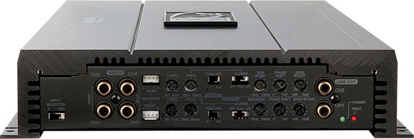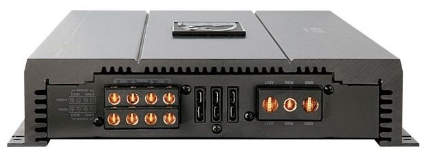 | Počet kanálů zesilovačeZesilovače se rozdělují na: - Monobloky - 2kanálové - 3kanálové - 4kanálové - 5kanálové - 6kanálové - více kanálové Každý kanál slouží na napájení jednoho reproduktoru u koaxialního typu, popř. jedné strany, pokud se jedná o komponentní reproduktory. Zesilovače typu monoblok se používají hlavně na subwoofery. 2kanálové jsou vhodné jak na subwoofery, tak například na přední pár reproduktorů v autě. 3kanálové se používá na přední nebo zadní reproduktory + subwoofer. 4kanálové se používají na přední + zadní reproduktory nebo 1 pár reproduktorů + subwoofer. 6 nebo 5kanálové se používají na 2 páry reproduktorů + subwoofer, nejčastěji. Můstkování znamená zapojení zesilovače do můstku, kdy se použije + pól z jednoho kanálu a - pól z druhého kanálu. Ve většině případů to bývá na zesilovači znázorněné jako "BRIDGED". | 4/3/2 |