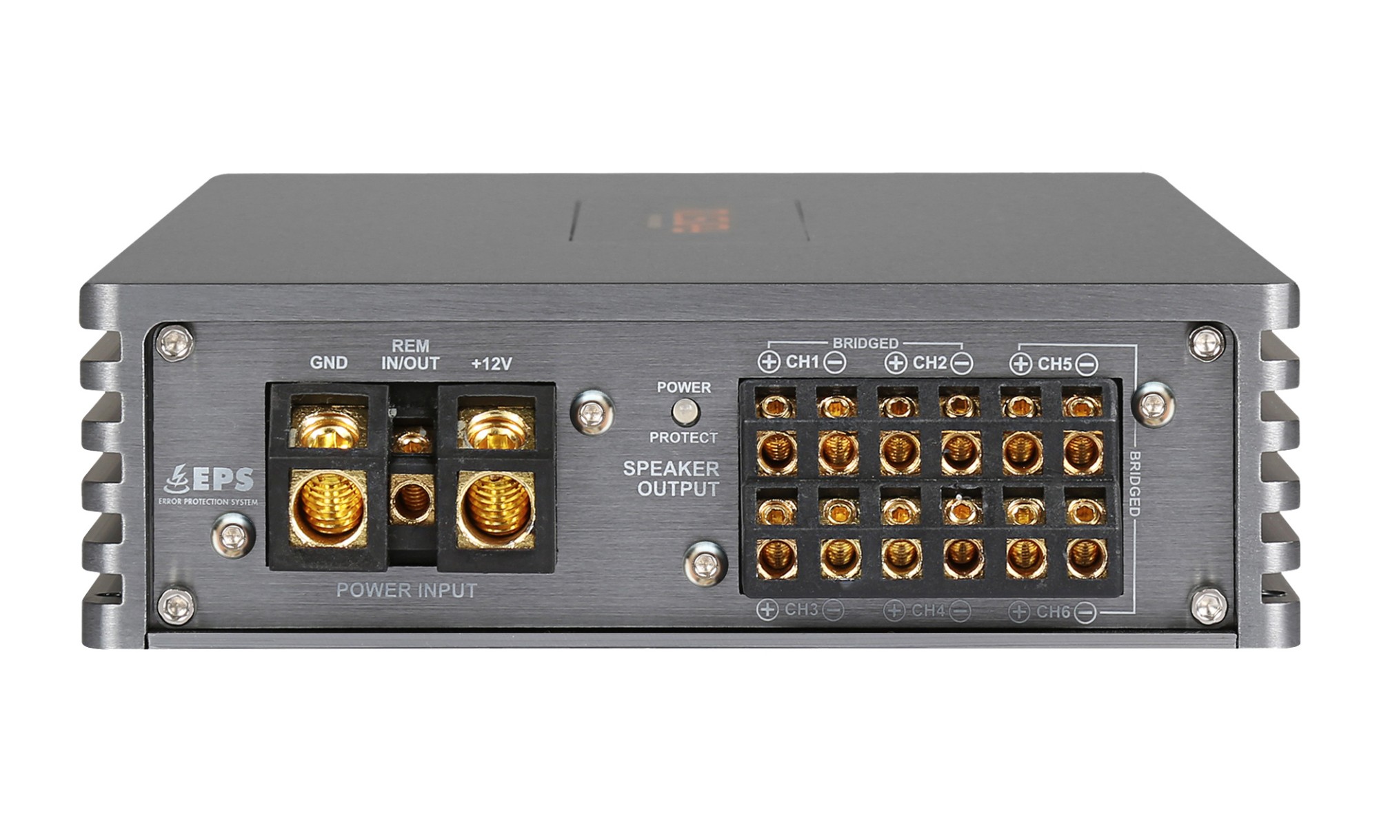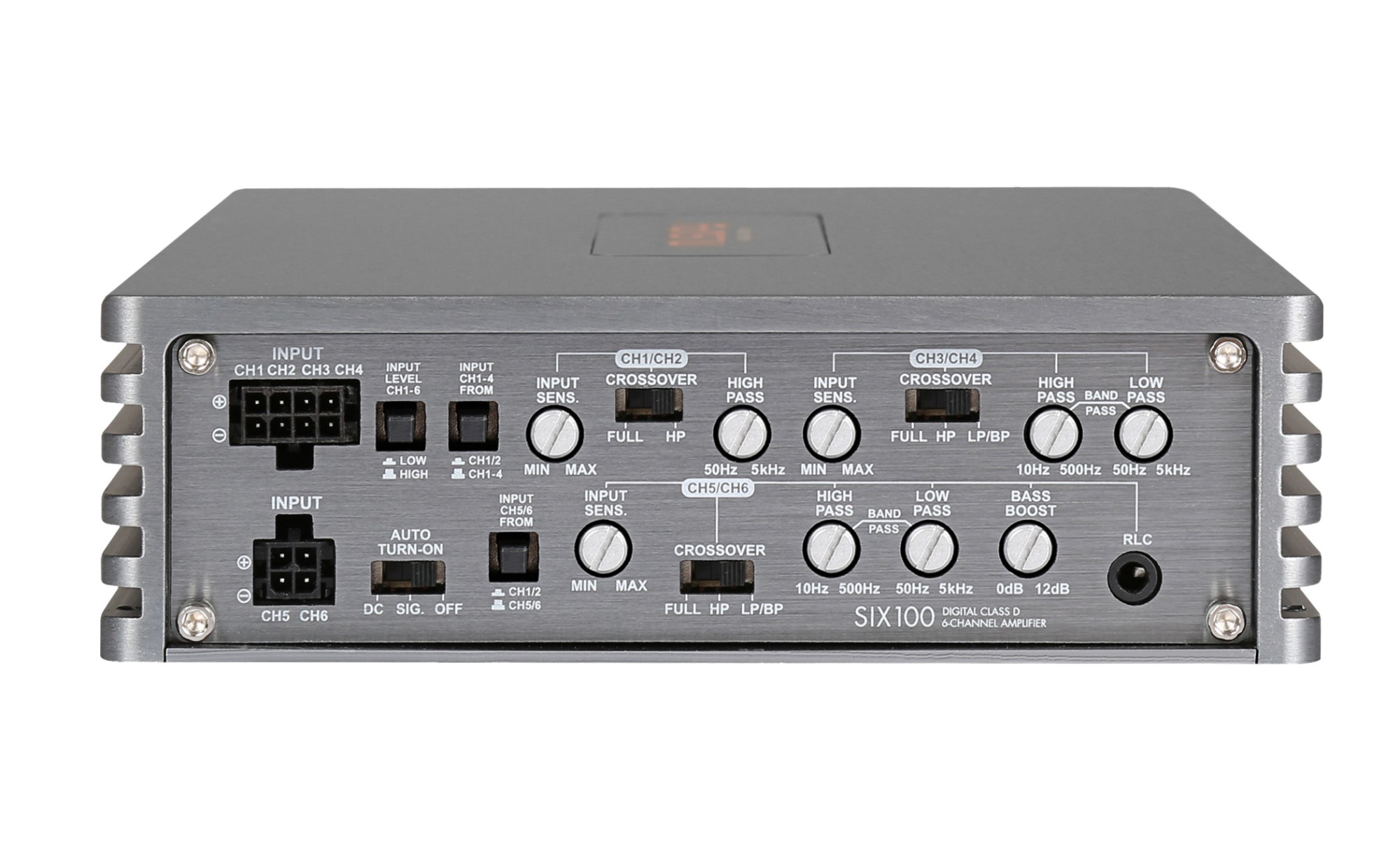 SIX100 je navržen tak, aby pokryl celé audio pásmo od výšek až po subwoofer v rámci jediného zesilovače. Nabízí výkon 6 × 110 W RMS při 4 Ω a až 6 × 180 W RMS při 2 Ω, případně možnost můstkového zapojení až 3 × 360 W RMS při 4 Ω, což výrazně rozšiřuje možnosti použití. Kanály 1/2 jsou vhodné i pro výškové reproduktory, zatímco kanály 3/4 a 5/6 umožňují bandpass konfigurace pro středobasy nebo subwoofery. Všechna tři kanálová párování jsou navíc můstkovatelná, což dovoluje zesilovač použít jak pro klasické komponentní systémy, tak pro plně aktivní sestavy nebo kombinaci s více subwoofery. Díky robustní konstrukci s MOSFET tranzistory má zesilovač dostatečnou výkonovou rezervu i pro náročnější reproduktory a udržuje kontrolu nad reprodukcí i při vyšší hlasitosti.