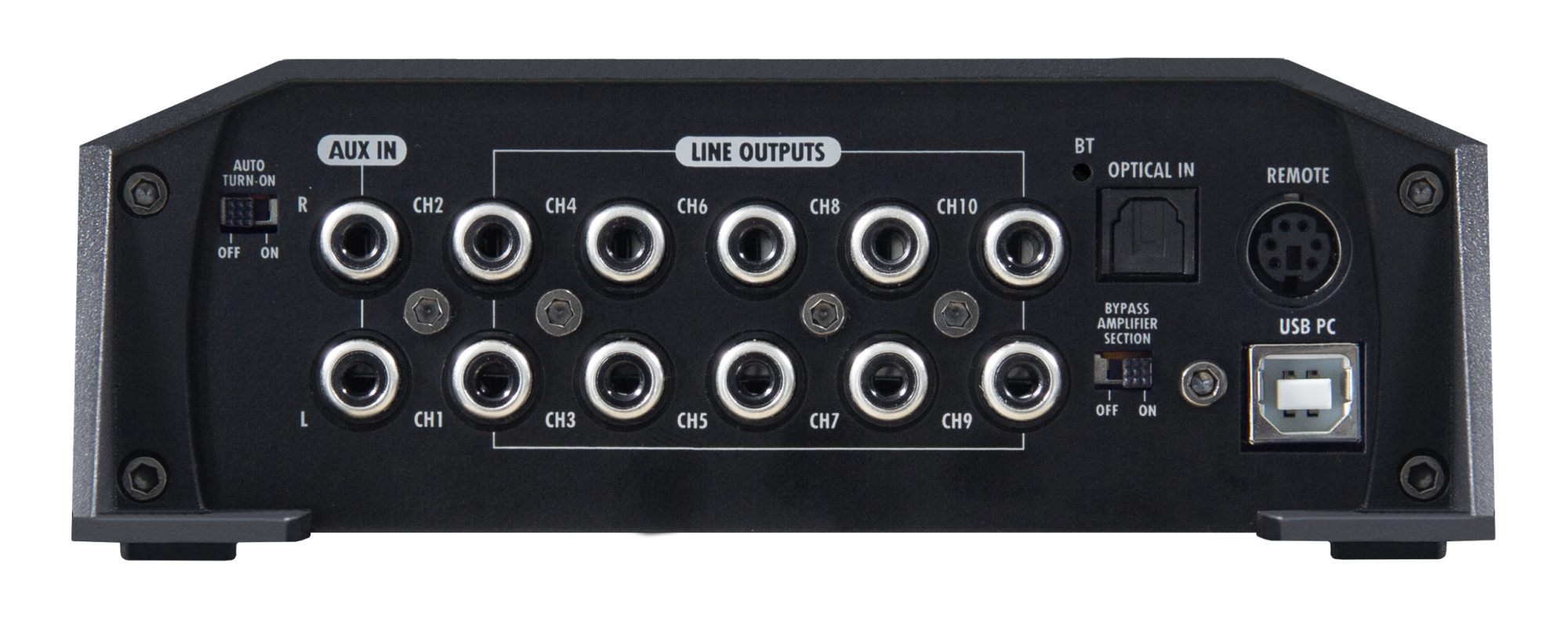 Zesilovač nabízí osm interních zesilovacích kanálů a zároveň plnohodnotný 10kanálový DSP procesor, který umožňuje řídit nejen interní výstupy, ale také externí zesilovače prostřednictvím RCA výstupů. Díky této flexibilitě lze zařízení použít jako kompletní centrální jednotku celého audiosystému – ať už jde o plně aktivní sestavu s oddělenými výškami, středobasy a subwooferem, nebo komplexní high-end instalaci s dalšími výkonovými zesilovači.