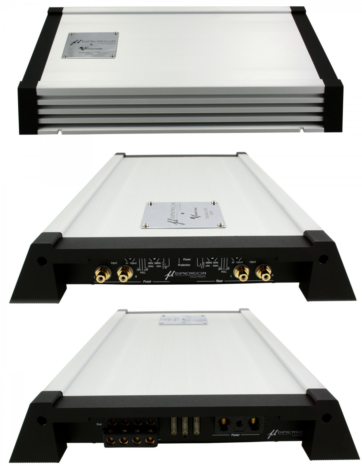 | Počet kanálů zesilovačeZesilovače se rozdělují na: - Monobloky - 2kanálové - 3kanálové - 4kanálové - 5kanálové - 6kanálové - více kanálové Každý kanál slouží na napájení jednoho reproduktoru u koaxialního typu, popř. jedné strany, pokud se jedná o komponentní reproduktory. Zesilovače typu monoblok se používají hlavně na subwoofery. 2kanálové jsou vhodné jak na subwoofery, tak například na přední pár reproduktorů v autě. 3kanálové se používá na přední nebo zadní reproduktory + subwoofer. 4kanálové se používají na přední + zadní reproduktory nebo 1 pár reproduktorů + subwoofer. 6 nebo 5kanálové se používají na 2 páry reproduktorů + subwoofer, nejčastěji. Můstkování znamená zapojení zesilovače do můstku, kdy se použije + pól z jednoho kanálu a - pól z druhého kanálu. Ve většině případů to bývá na zesilovači znázorněné jako "BRIDGED". | 4/3/2 |