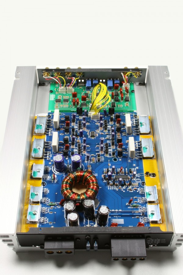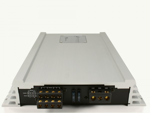 | Počet kanálů zesilovačeZesilovače se rozdělují na: - Monobloky - 2kanálové - 3kanálové - 4kanálové - 5kanálové - 6kanálové - více kanálové Každý kanál slouží na napájení jednoho reproduktoru u koaxialního typu, popř. jedné strany, pokud se jedná o komponentní reproduktory. Zesilovače typu monoblok se používají hlavně na subwoofery. 2kanálové jsou vhodné jak na subwoofery, tak například na přední pár reproduktorů v autě. 3kanálové se používá na přední nebo zadní reproduktory + subwoofer. 4kanálové se používají na přední + zadní reproduktory nebo 1 pár reproduktorů + subwoofer. 6 nebo 5kanálové se používají na 2 páry reproduktorů + subwoofer, nejčastěji. Můstkování znamená zapojení zesilovače do můstku, kdy se použije + pól z jednoho kanálu a - pól z druhého kanálu. Ve většině případů to bývá na zesilovači znázorněné jako "BRIDGED". | 4/3/2 kanálový |